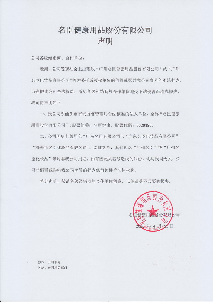 近期公司发现社会上出现以“广州名臣健康用品股份有限公司”或“广州名臣化妆品有限公司”等为委托或授权单位的假冒或影射我公司商号的不法行为,为维护公司合法权益,避免各级经销商及合作单位遭受不法侵害而造成损失,我司特告知如下: